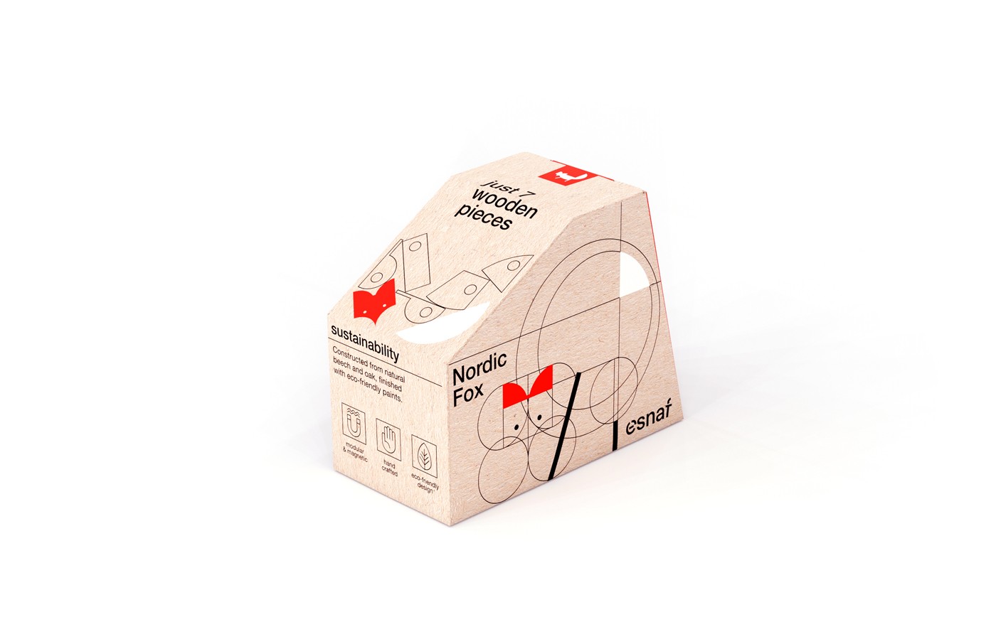 Nordic Fox è un giocattolo magnetico in legno, composto da 7 moduli. Progettato da architetti, prodotto in Bulgaria con materiali locali e vernici ecologiche. L’obiettivo è ripensarne il packaging per un'ipotetica Heritage Icons Collection, linea che celebra i classici Esnaf Toys.