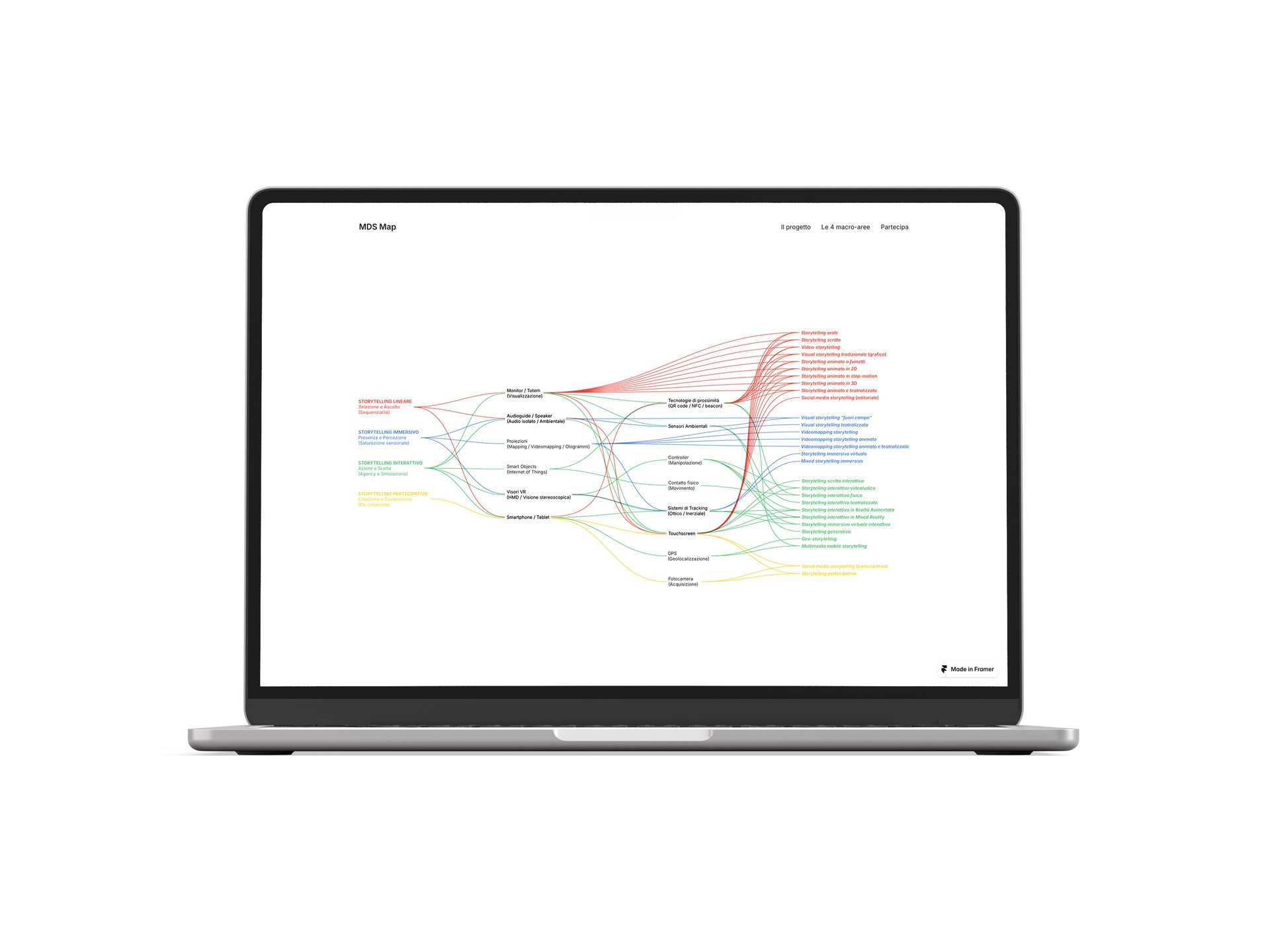 L'interfaccia è stata sviluppata in Framer per garantire aggiornabilità e interazione fluida. Il fulcro della User Experience è il Dendrogramma nella Hero Section: una visualizzazione dati che permette ai progettisti di vedere a colpo d'occhio le relazioni tra hardware (dispositivi) e intenzioni narrative.